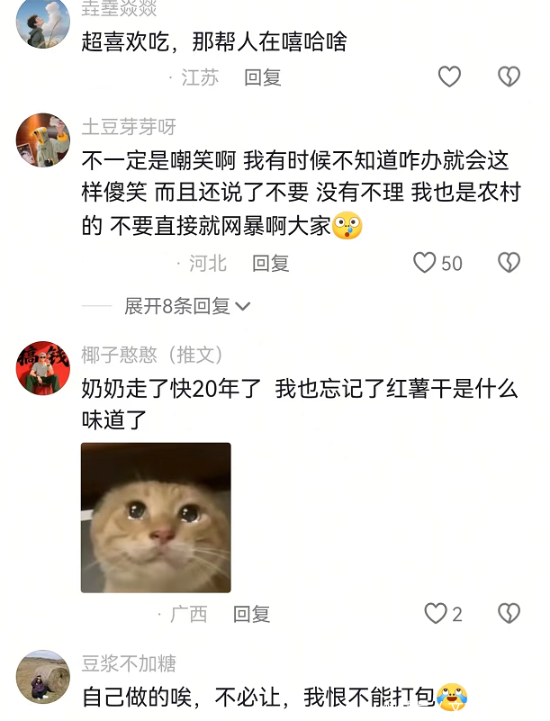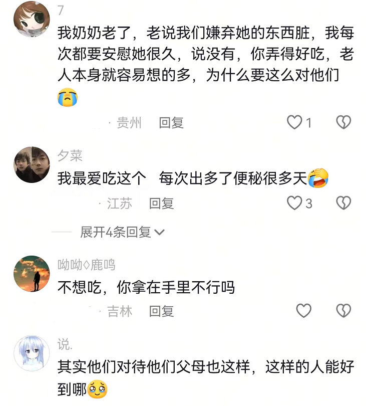 这些嘲笑老奶奶地瓜干的人,人格底色就是有问题的。她们可能往往在生活中,没有得到足够的尊重。